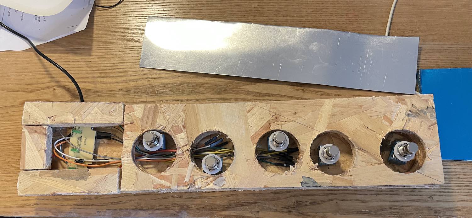 In mid-2025, I joined a Pink Floyd cover band who required me to handle all keys parts and all sound effects, without any backing tracks. I've already made and use a foot controller for when more notes are needed but my hands are both busy, and now I needed a quick way to trigger SFX without taking my hands off of the keyboard. I also had some left over material lying around from the construction of the aforementioned MISC1, which would be good to use up.