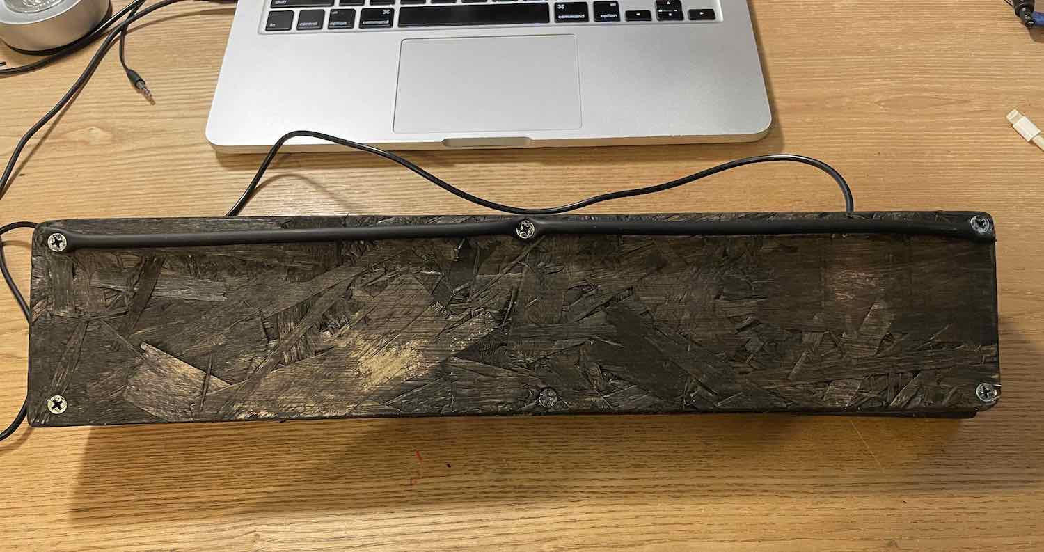 Finishing touches were few and far between; I had a matter of weeks before the first gig with this band, and so needed to throw this project together quickly so I had time to practice with it sufficiently. The whole thing had all sharp and splintered edges sanded down, and was then painted black to look better on stage. When I painted MISC1, I used a mixture of PVA glue and black paint, with the hope that this would seal the flakey surface of the chipboard better than paint alone. This doesn't seem to be the case; the paint-only covering on QKC1 does a fine job of preventing flaking.