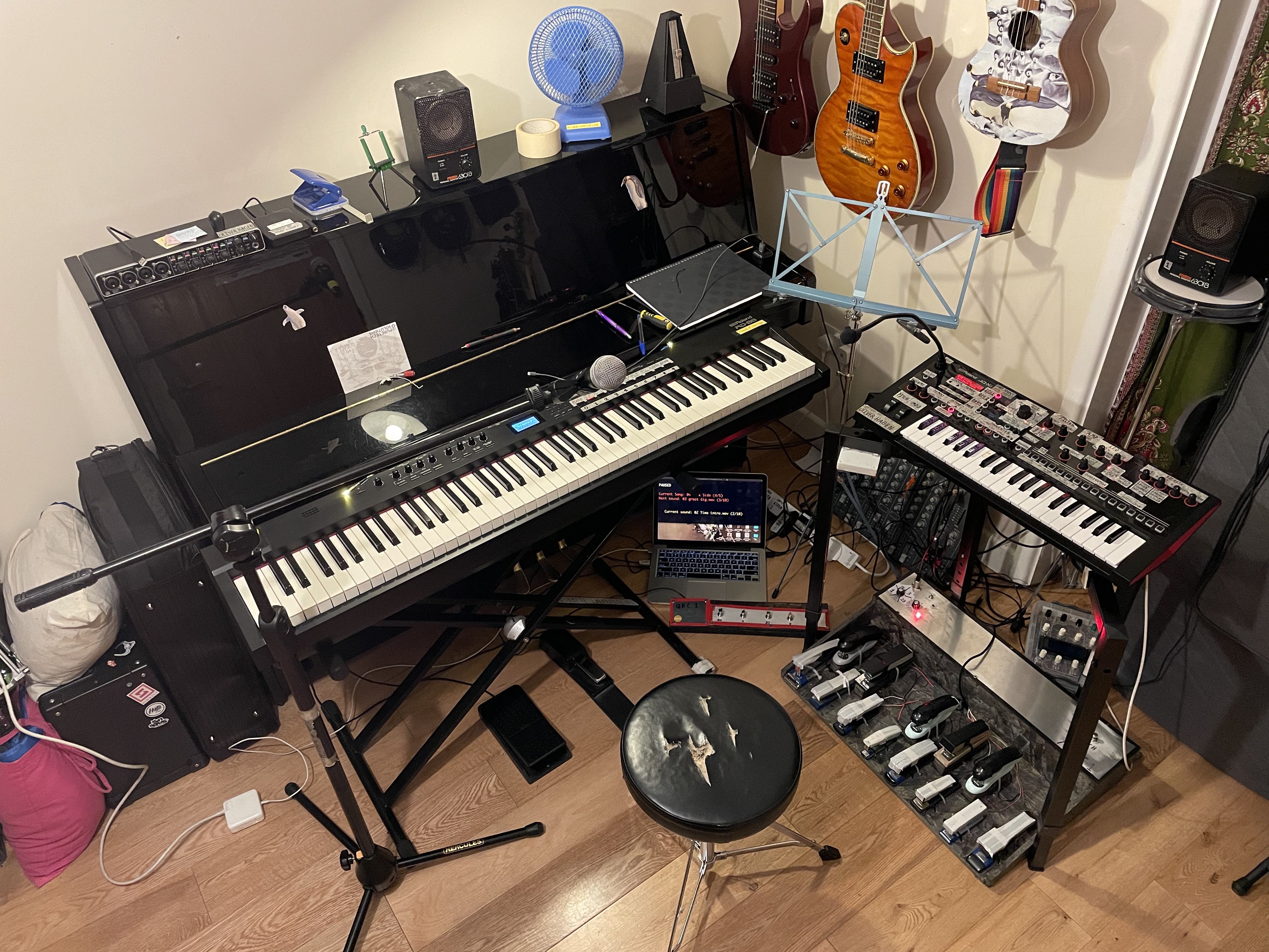 The finished device+my laptop has a spot in my keyboard setup in-between the stage piano and the synthesiser, on the 45 degree angle. It nestles in pretty snugly, but is accessible enough. Audio comes out of my laptop's headphone jack and goes into my stage piano via the external audio input, allowing me control over the volume via a dedicated knob on the stage piano- useful for fades or unexpected volume level jumps. This increases my minimum plug socket requirement for the full rig to three (my laptop is ancient and the battery is no longer capable of holding enough charge for several hours of soundcheck + gig), so now I bring an extension cable of my own to gigs.